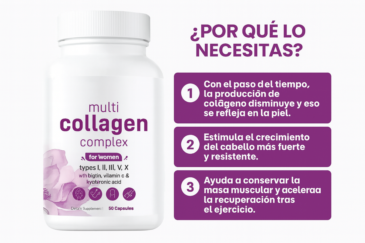 DescubreVitaNova Colágeno – Multi Collagen Complex, el suplemento premium que combina5 tipos de colágeno (I, II, III, V y X)junto conBiotina, Vitamina C y Ácido Hialurónico, para un cuidado integral de tu piel, cabello, uñas y articulaciones.